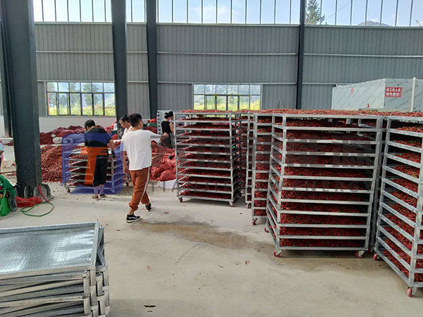 4、烘干面全。無需依靠手動操作來改變換料車的位置,翻轉等,紅線椒烘干機烘干的效率更高;